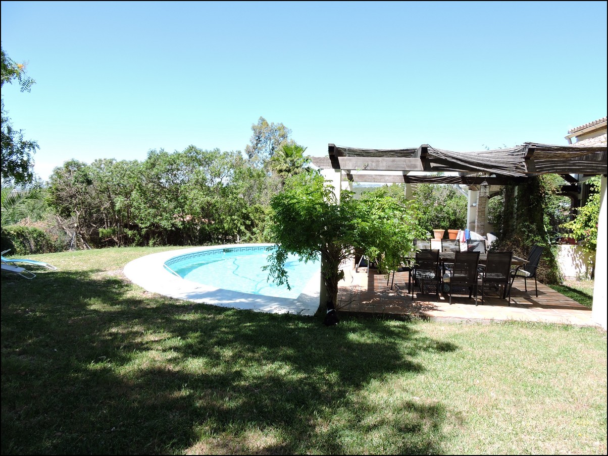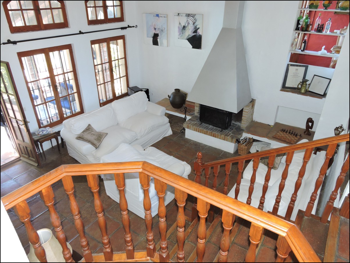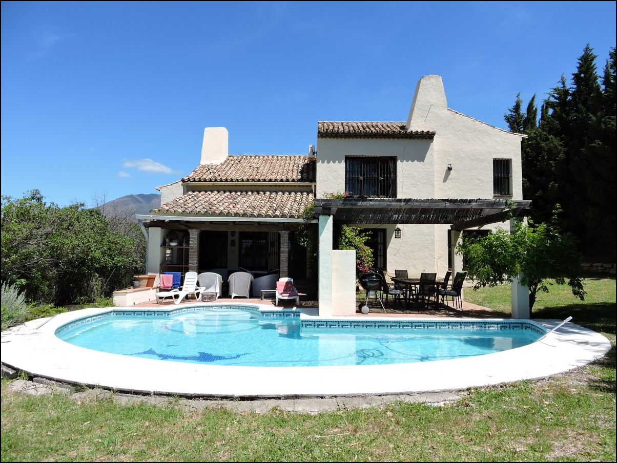 • Overview: Large 5 bed / 3 bath villa in the exclusive urbanisation of Don Pedro Estepona, located in an ideal and very private location, but close to Estepona, Sabinillas, Marbella or Gibraltar. Amazing architecture in this high standard 80s independent villa with private pool and with sea views! Total plot is 1520M2 and the house is built 274M2 + another downstairs studio. The studio is about 60M2 and has its own bathroom and separate entrance. The main house has a total of 4 bedrooms and 2 bathrooms. They are all very large and with built-in wardrobes. Large living room with a beautiful big fire place that will heat the whole house in the winter period and ceilings of about 5meters high, fantastic architecture, lots of natural light. Perfect for a Spanish home. The house is situated on different levels, so you will walk up and down some stairs when you want to go from the living to the kitchen or from the entrance to the bedrooms. Next to the already large living space you have another separate area to quietly read a book and enjoy this wealthy feeling. From the living area you walk out into your private plot with private swimming pool. Very nice entertainment area with built-in barbecue and even some sea views! The garden itself is lovely, green, well taken care of and not of huge maintenance. Up from the living room you have a dining area and a large open fully fitted kitchen; this would need some modernization, but is nice and fully functional. All bedrooms have air condition installed. A beautiful and spacious villa in a quiet location, only 5 minutes drive from the beach. The urbanization is very secure and has security cameras. Outside space for two cars underneath a covered parking area and the house will be sold fully furnished. Easy to visit, if you have any further questions, do not hesitate to contact us now..